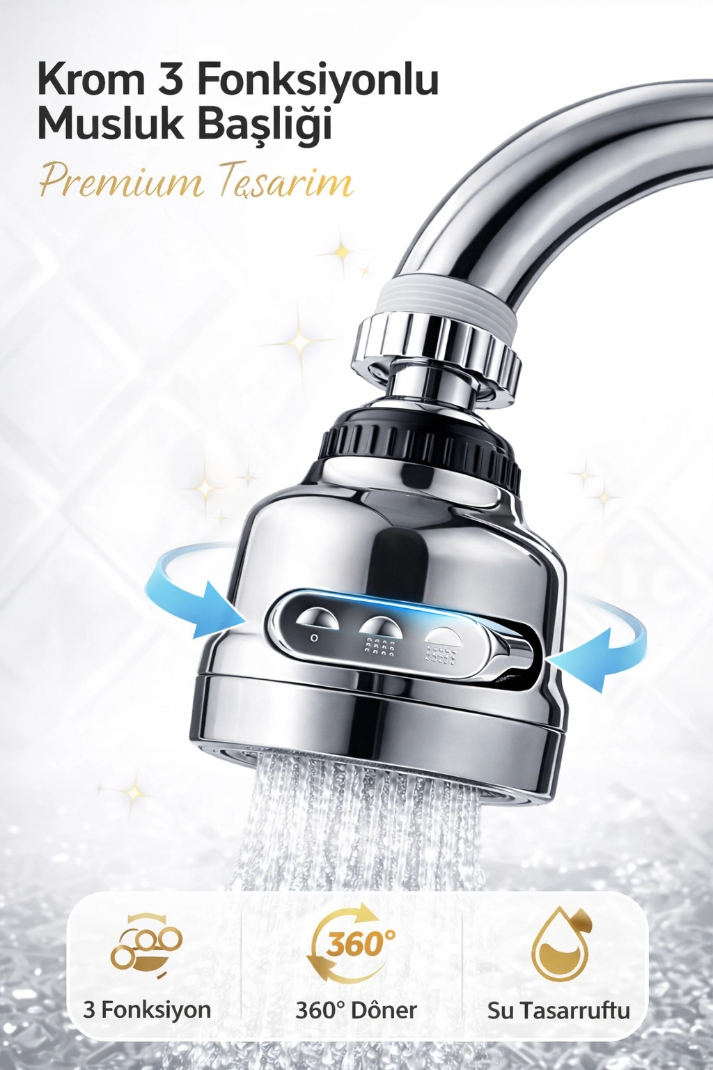 Şıklığı ve fonksiyonu tek bir üründe buluşturan 3 Fonksiyonlu 360° Döner Krom Musluk Başlığı, mutfağınıza modern bir dokunuş katarken su kullanımınızı daha akıllı hale getirir.