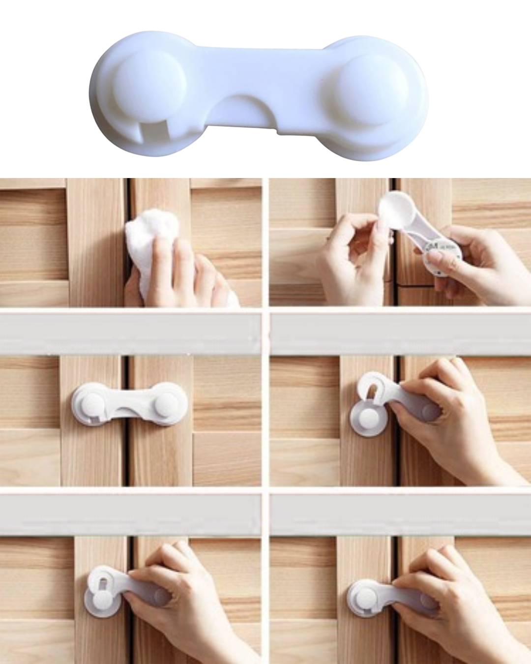 4 adet emniyet dolap kilidi, çocukların meraklı ellerini dolap kapaklarından uzak tutmak için geliştirilmiştir. Güçlü yapışkan bantları sayesinde yüzeye sağlam şekilde tutunur. Montajı son derece pratiktir ve herhangi bir alet gerektirmez.