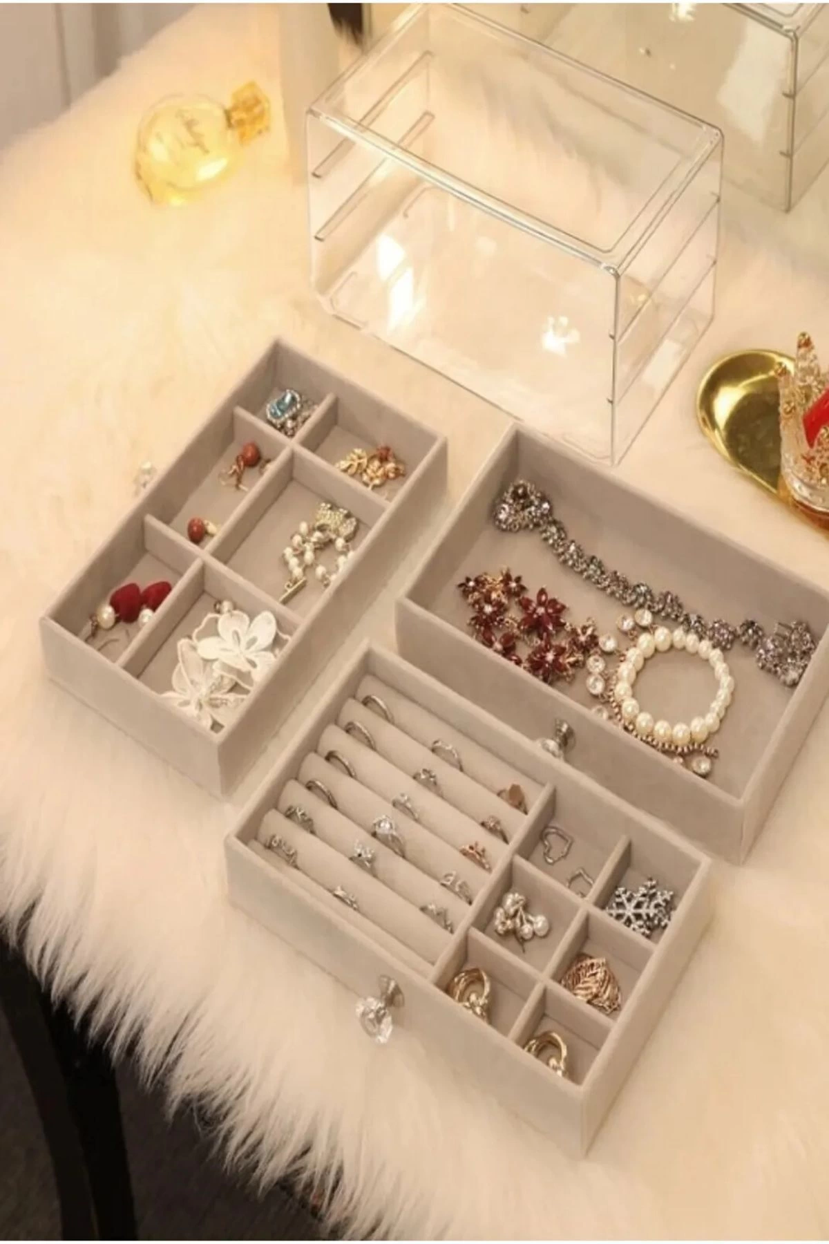 Üst Kat (Şeffaf Kapaklı): Günlük kullandığınız yüzükler, küçük halka veya top küpeler için tasarlanmış küçük bölmeler burada yer alır.