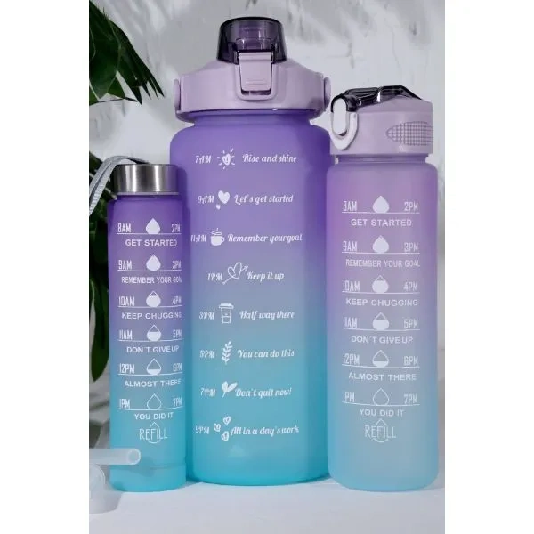 MOTİVASYON SULUK SETİÜrün ÖzellikleriSağlıklı Tritan malzemeden üretilmiştir.BPA, Fitalat ve toksit madde içermez, koku yapmaz, çocukların ve yetişkinlerin sağlığı için kesinlikle güvenlidir.BPA ve toksin içermez, son derece dayanıklı ve BPA içermeyez Lütfen bulaşık makinesinde veya sıcak su ile yıkamayınız..Kapağı 2 kademeli açılmaktadır, kapağı sonuna kadar ittirin, kapak sabitlenecektir.Böylelikle suyunuzu daha rahat içebilirsiniz.2.000 ML – 750 ML- 300 ML 3 lü set motivasyonel zaman çizelgeli su matarası bir günlük su ihtiyacınızın tamamını karşılar.Ilham verici alıntılar ve net zaman işaretçisi ile bu su matarası günlük su alımını izlemek ve gün boyunca su tüketimini teşvik etmek için harikadır.Birbirinden farklı canlı renk tasarımlarıyla yalnızca kendiniz için değil, aynı zamanda sevdikleriniz için güzel bir hediyedir.Bu uzun ömürlü su matarası sayesinde günlük pet şişe kullanımınızı azaltabilirsiniz.2.000 ML – 750 ML- 300 ML 3 lü set su matarası, suyunuzu günde birçok kez yeniden doldurmak zorunda kalma sorununu çözer.tasarımı sayesinde su akıtmaz akıntı yapmaz, farklı kullanım seçenekleri ile pipetli veya pipetsiz olarak kullanılabilir, özel sapı ile her yere kolaylıkla taşınabilir.Paket İçeriği3 lü motivasyon suluk seti