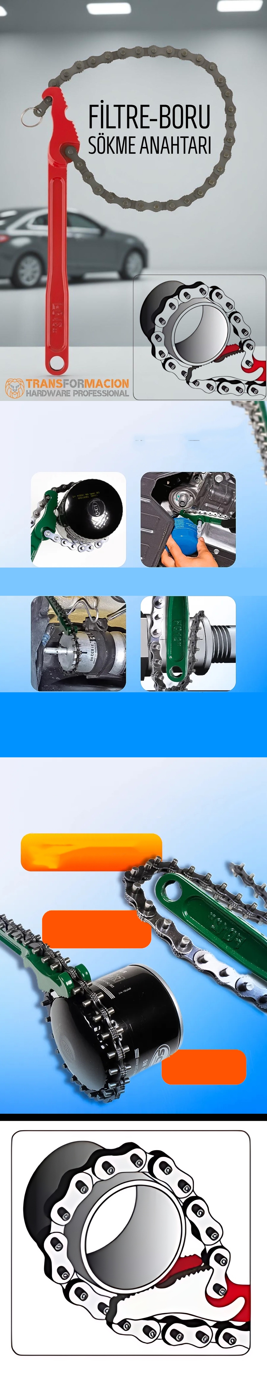 – ergonomik tesisat ekipmanı”Bu paslanmaz çelik zincirli boru anahtarı, ev tipi ya da profesyonel tesisat işlemlerinde kullanılan, filtre ve boru sökme işlerini kolaylaştıran ayarlanabilir yapıya sahip bir filtre çıkarma aracıdır.”